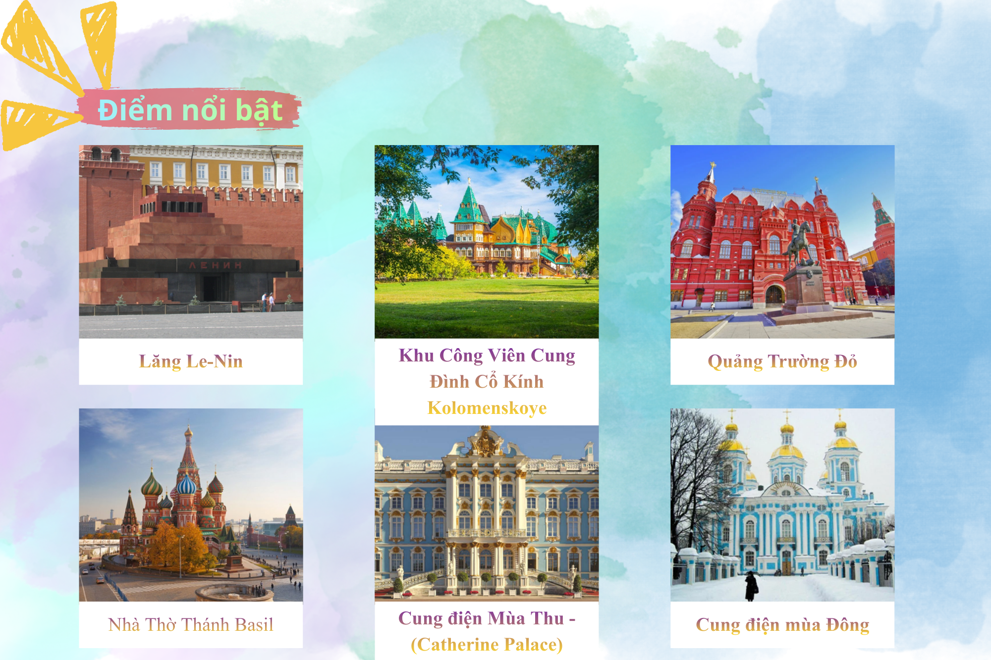 Nga gây ấn tượng bởi vẻ đẹp tráng lệ và rộng lớn, nơi những công trình kiến trúc dát vàng, cung điện nguy nga và quảng trường cổ kính hòa quyện cùng thiên nhiên hùng vĩ trải dài từ châu Âu sang châu Á. Từ cung điện Mùa Đông, điện Kremlin đến những thị trấn phủ tuyết và rừng bạch dương lãng mạn, Nga mang nét đẹp vừa cổ điển, vừa thơ mộng. Văn hóa Nga đặc trưng bởi nghệ thuật ballet, văn học kinh điển, âm nhạc cổ điển và lối sống trầm lắng nhưng sâu sắc. Tất cả tạo nên một đất nước rộng lớn, bí ẩn và đầy sức hút đối với du khách yêu nghệ thuật, lịch sử và cảnh quan thiên nhiên.