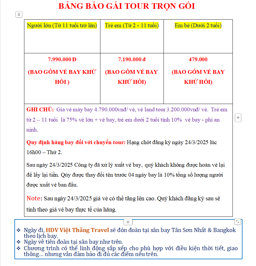 09h00: Hướng dẫn viên VIET THANG TRAVEL đón quý khách tại cột số 5, lầu 2, ga đi quốc tế - sân bay Tân Sơn Nhất. Sau đó, hướng dẫn viên làm thủ tục cho đoàn bay đi Thái Lan