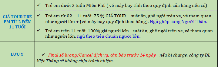 Chú ý : Thứ tự chương trình  thể thay đổi theo sự sắp xếp của VIET THANG TRAVEL để phù hợp với giao thông, thời tiếc tình hình sức khỏe nhưng vẫn đảm bảo đầy đủ các điểm tham quan đã nêu trong chương trình