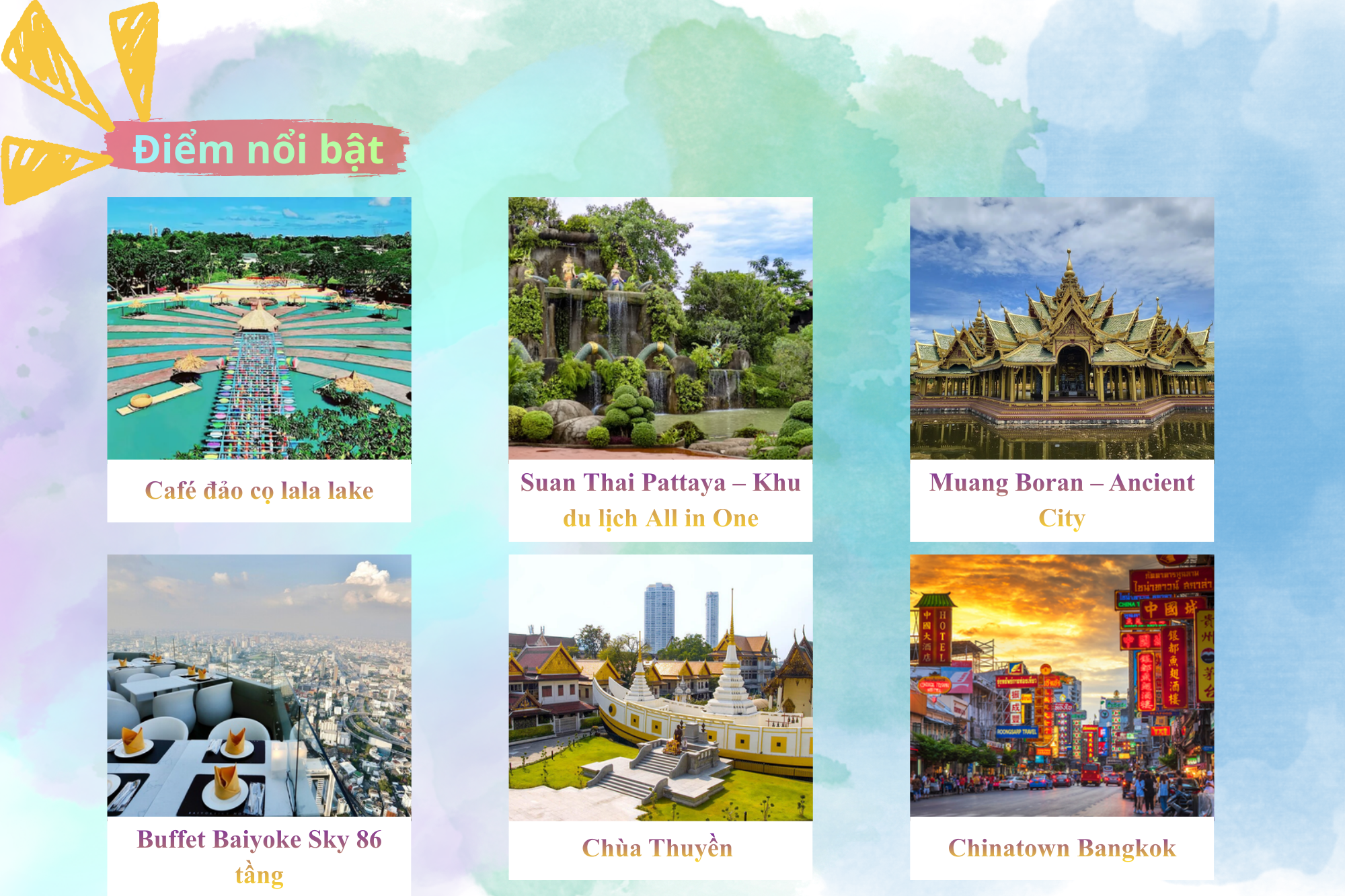 Thái Lan cuốn hút du khách bởi vẻ đẹp rực rỡ của xứ sở Chùa Vàng, nơi văn hóa truyền thống và nhịp sống hiện đại hòa quyện đầy màu sắc. Từ những ngôi chùa vàng uy nghi, các khu chợ nổi tấp nập, cho đến thiên đường mua sắm sôi động và ẩm thực đường phố phong phú, tất cả tạo nên một nét đặc trưng rất riêng. Con người Thái hiền hòa, thân thiện cùng lối sống “sabai sabai” giúp du khách luôn cảm thấy thoải mái và dễ chịu. Thái Lan vì thế trở thành một trong những điểm đến hấp dẫn nhất châu Á, nơi ai đến cũng muốn quay trở lại.